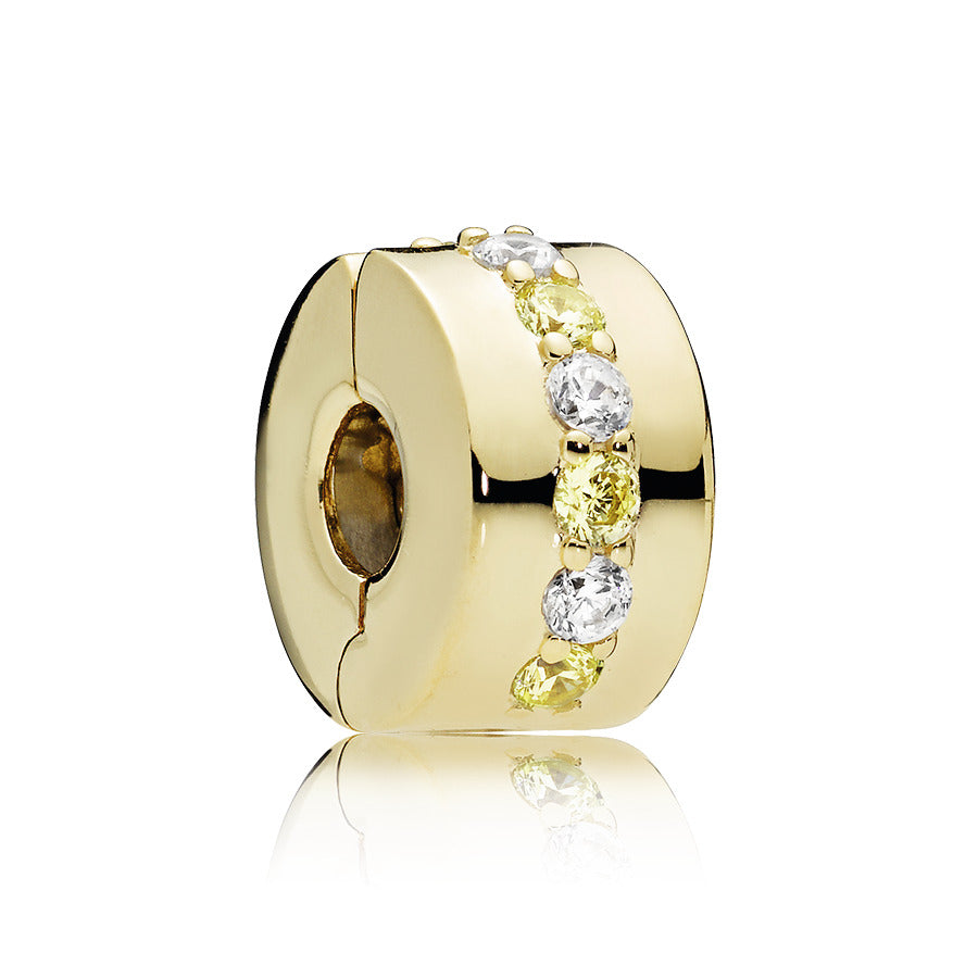 Our clip charms create balance on Pandora Moments bracelets. evenly spacing your adornments as well as adding decorative finish. This polished 14k Gold Plated iteration is carefully crafted from our unique metal blend plated with 18k gold and detailed by hand with a row of alternating yellow and clear cubic zirconia. perfect for adding a splash of colour to your look. Mix and match with other favourites from the collection.