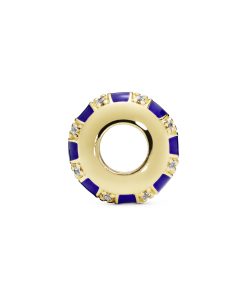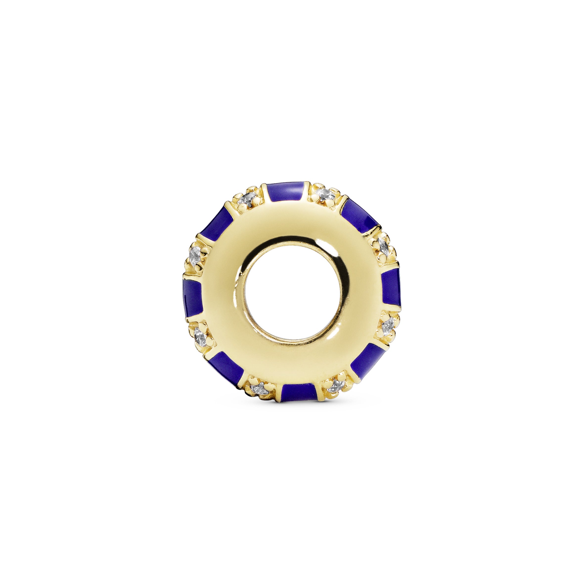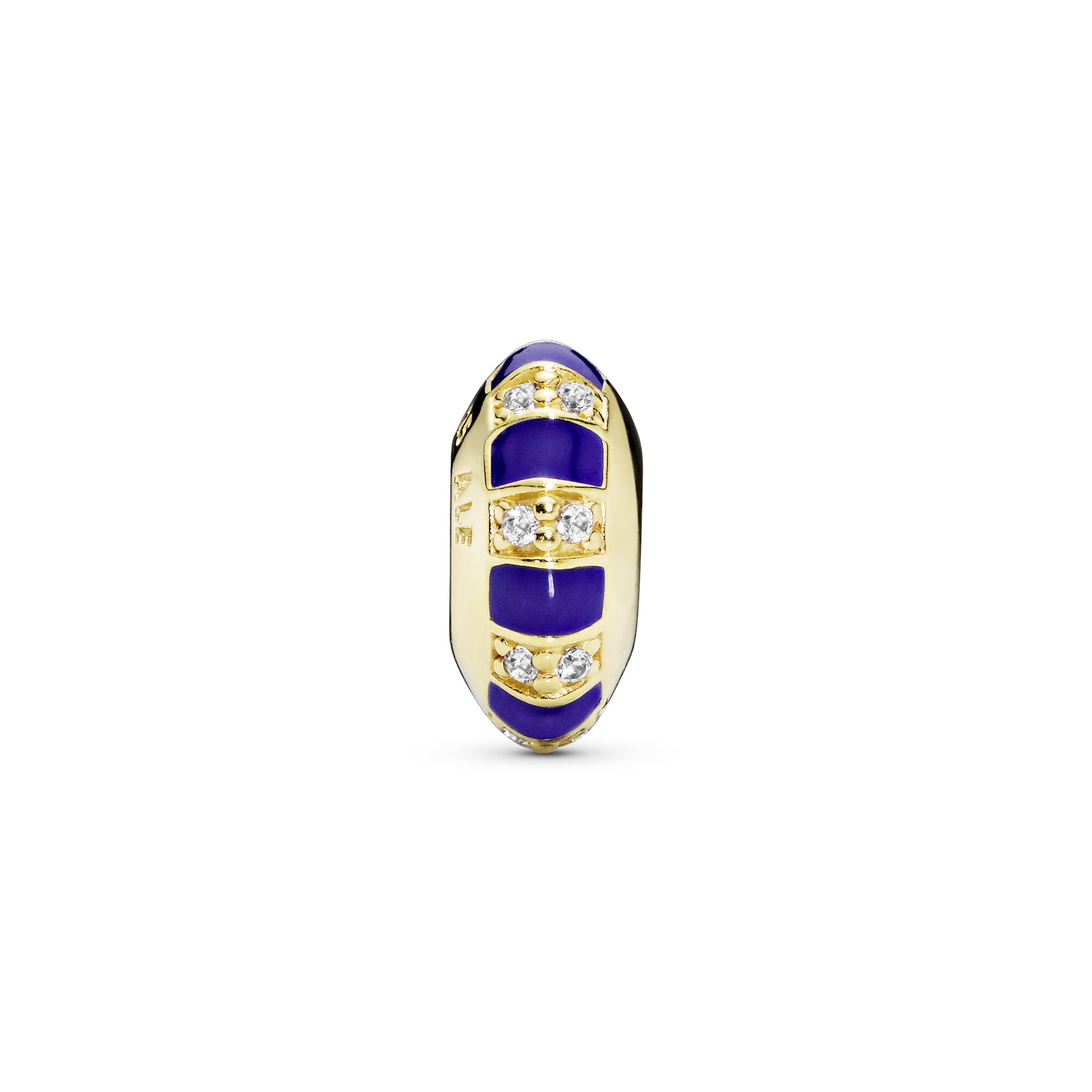 This Pandora spacer is hand-finished in 14k Gold Plated . our 18k gold-plated unique metal blend. to lend extra dimension to your Pandora Moments bracelet or bangle. Shaped to a point. embellished with cubic zirconia and detailed with hand-applied blue enamel in alternating rows. the charm provides a vibrant way to keep your bracelet styling evenly spaced.