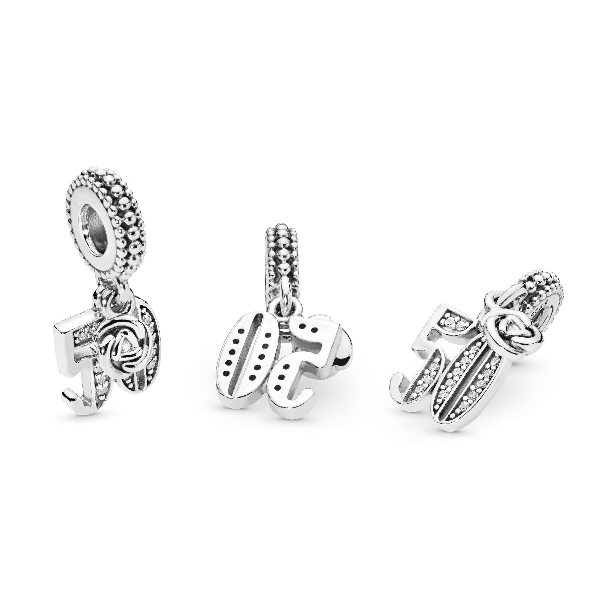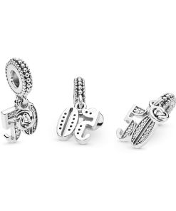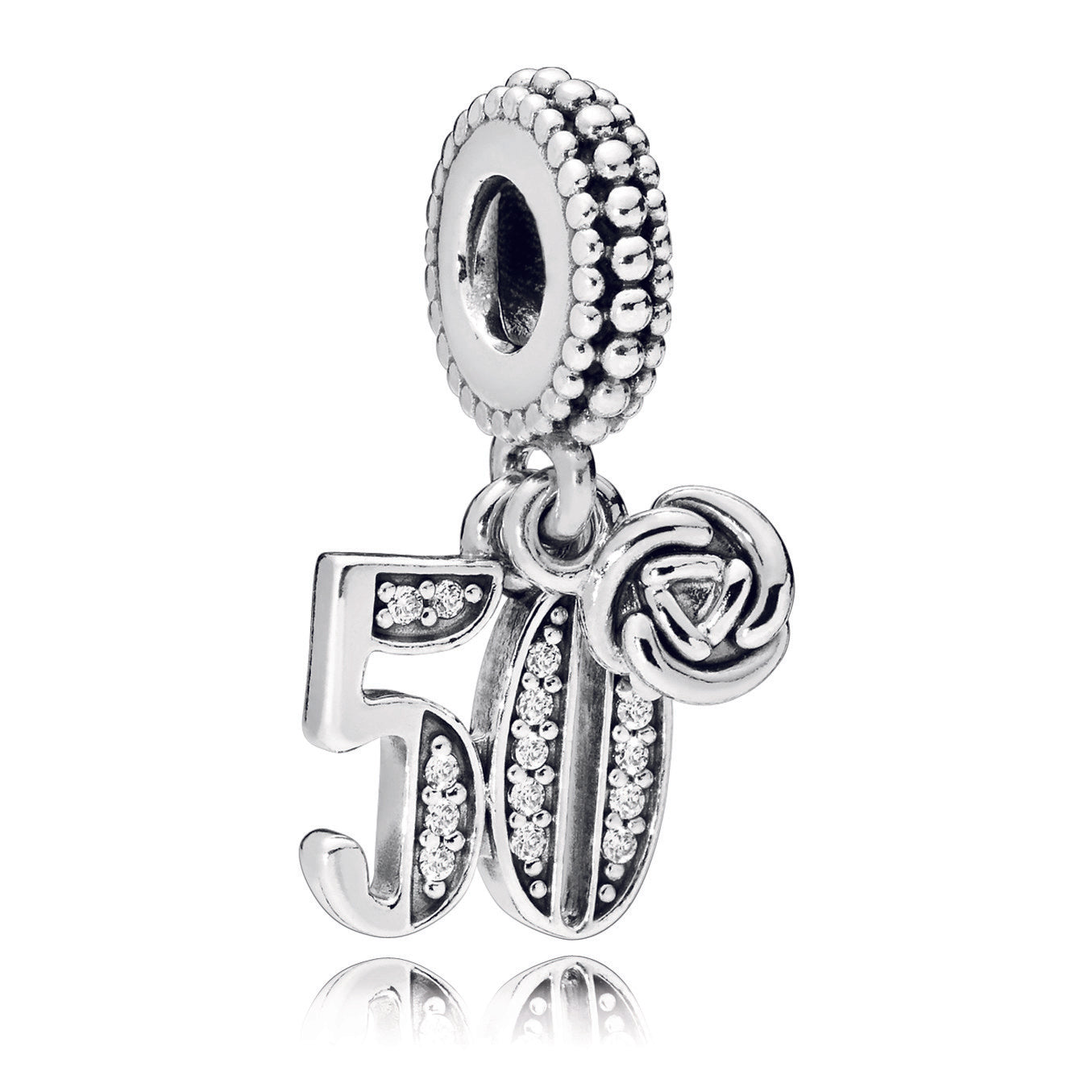 Whether you’re celebrating a 50th anniversary or a half-century birthday. this nifty fifty charm is the one to do it with. The sterling silver dangle is accented with cubic zirconia and detailed on the bail with beading. A miniature rosebud pendant completes the celebratory style. Wear or share the Pandora Moments piece as part of your unique story.