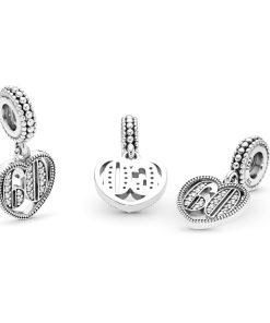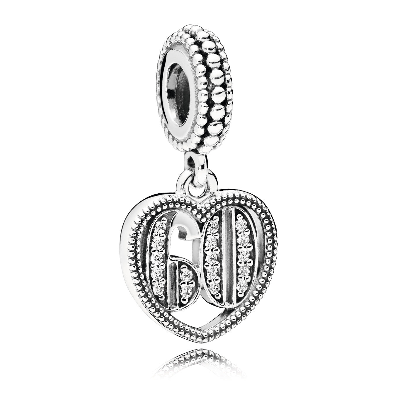 Detailed with the number 60. our celebratory dangle charm in sterling silver is set with glittering cubic zirconia for subtle sparkle. The heart-shaped style is ideal for commemorating a 60th birthday or anniversary – or whatever the number means to you. Thread it on a Pandora Moments bracelet or wear it as a pendant on a necklace chain.