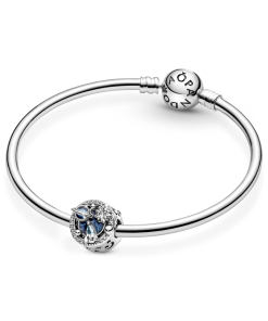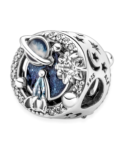 Reflect the serene beauty of the cosmos with A Trip To The Galaxy Charm. One side of the charm features a spaceship made from a pear-shaped icy blue crystal stone. a glittering planet in colourful hand-applied enamel and a star. Cut-out crescent moons. stars and sparkling stones set in stars decorate the sides of the charm. Add the celestial beauty of the galaxy to any look with this luminescent charm.