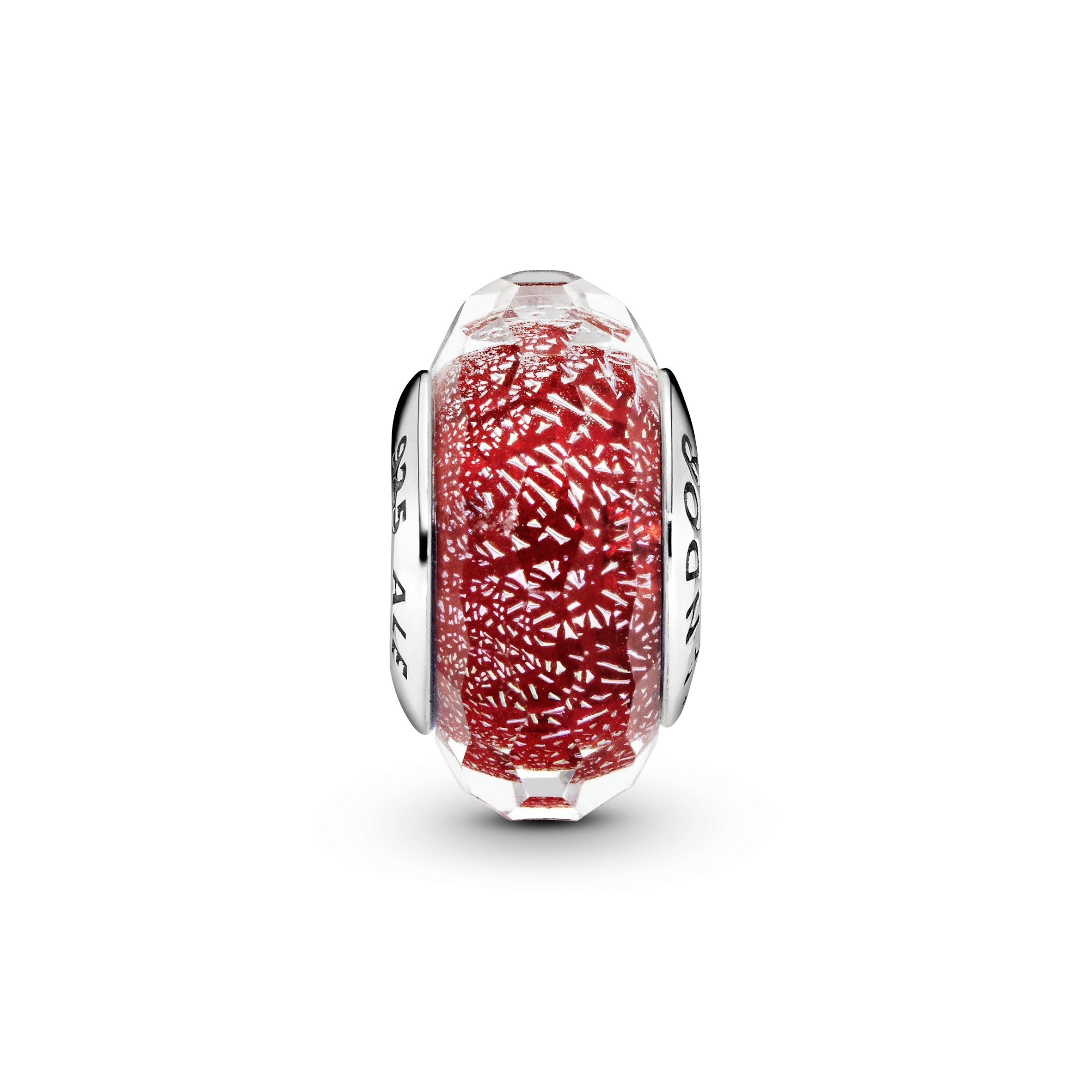 Add fiery red tones and flecks of sparkle to your look with this Murano glass charm. Set on a sterling silver core. the iridescent glass is faceted to reflect the light from every angle. Wear it on a Pandora Moments bracelet or bangle to add a pop of colour and personal meaning to your styling.