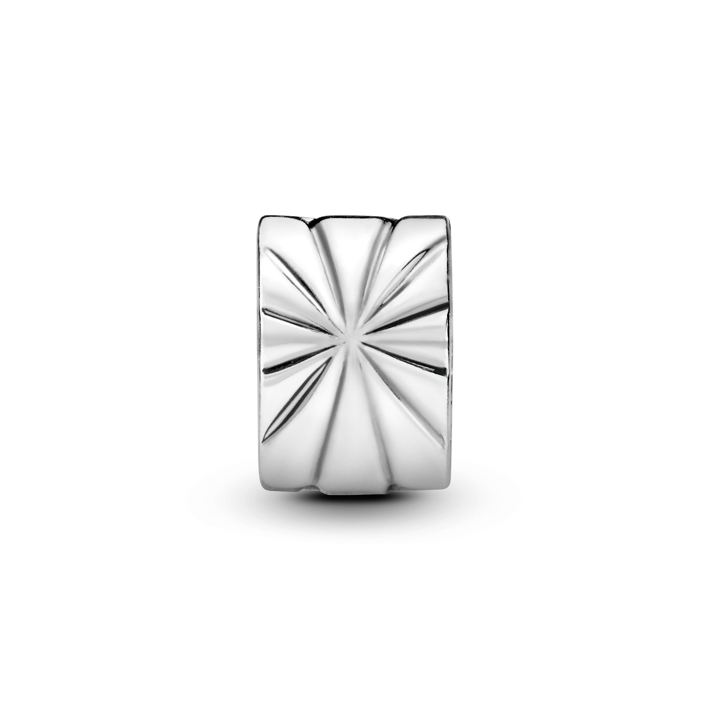 Decorated with artistic strokes resembling a sunburst pattern. this sterling silver clip charm helps evenly space out charms to balance your Pandora Moments bracelet. The polished piece is decorative enough to wear alone or with a handful of charms as part of a minimalist styling.