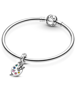 Express yourself with the Artist’s Palette Dangle Charm. Hand-finished in sterling silver. this colorful charm represents a 3D artist’s palette with five vivid paint colors represented by red cubic zirconia and pink. yellow. green and blue crystal stones. The creative charm also features two paint brushes with bristle details and sterling silver beads at the tail. Inspired by the idea of pursuing your passions and living your life creatively. let this charm be a reminder to embrace your unique point of view.