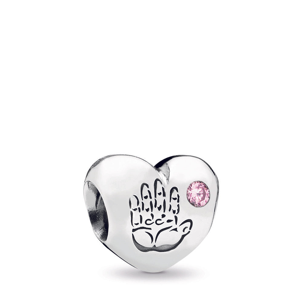 The adorable baby girl charm is the perfect gift for someone who has just given birth to a beautiful baby girl. Made from sterling silver. the charm has been crafted into a heart shape with a small handprint engraved into the side. To represent a girl. a pink cubic zirconia has been set next to the engraving.