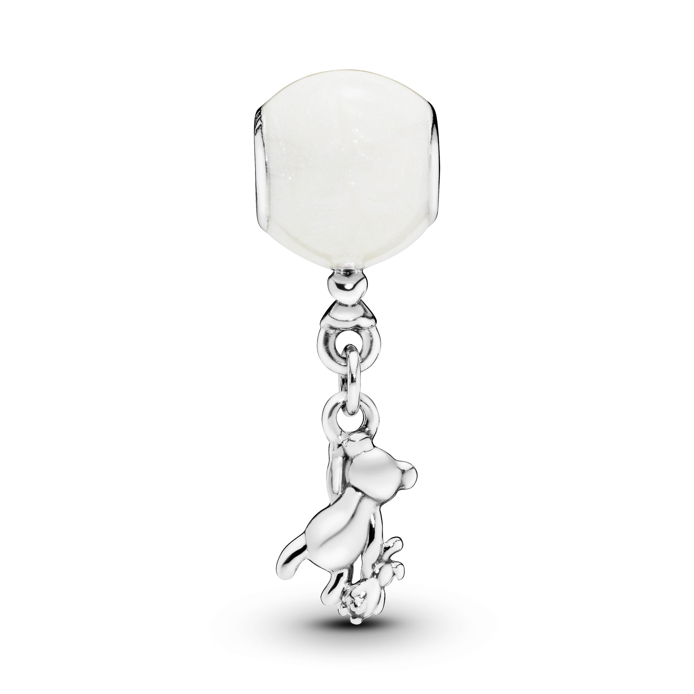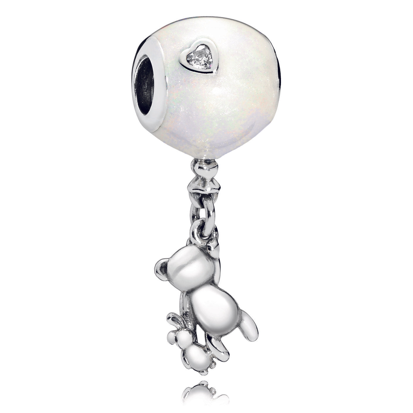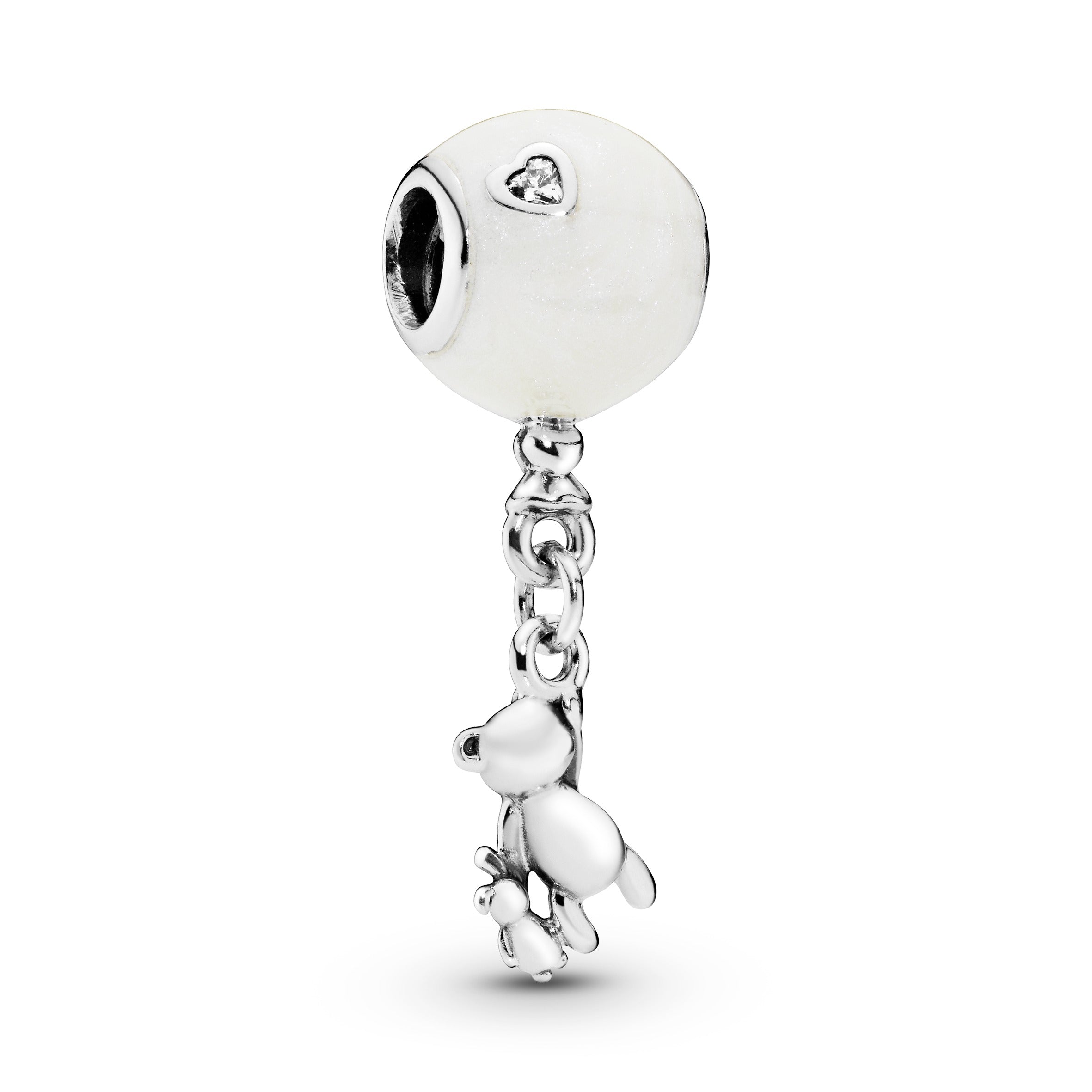 Reminisce over childhood memories with this dangle charm. Depicting a teddy bear and his rabbit friend floating from a balloon. this adorable design adds delicate movement to a Pandora Moments bracelet or necklace. Crafted from sterling silver. it’s finished with shimmering silver enamel and a heart-shaped cubic zirconia. Wear it as part of the story of you.
