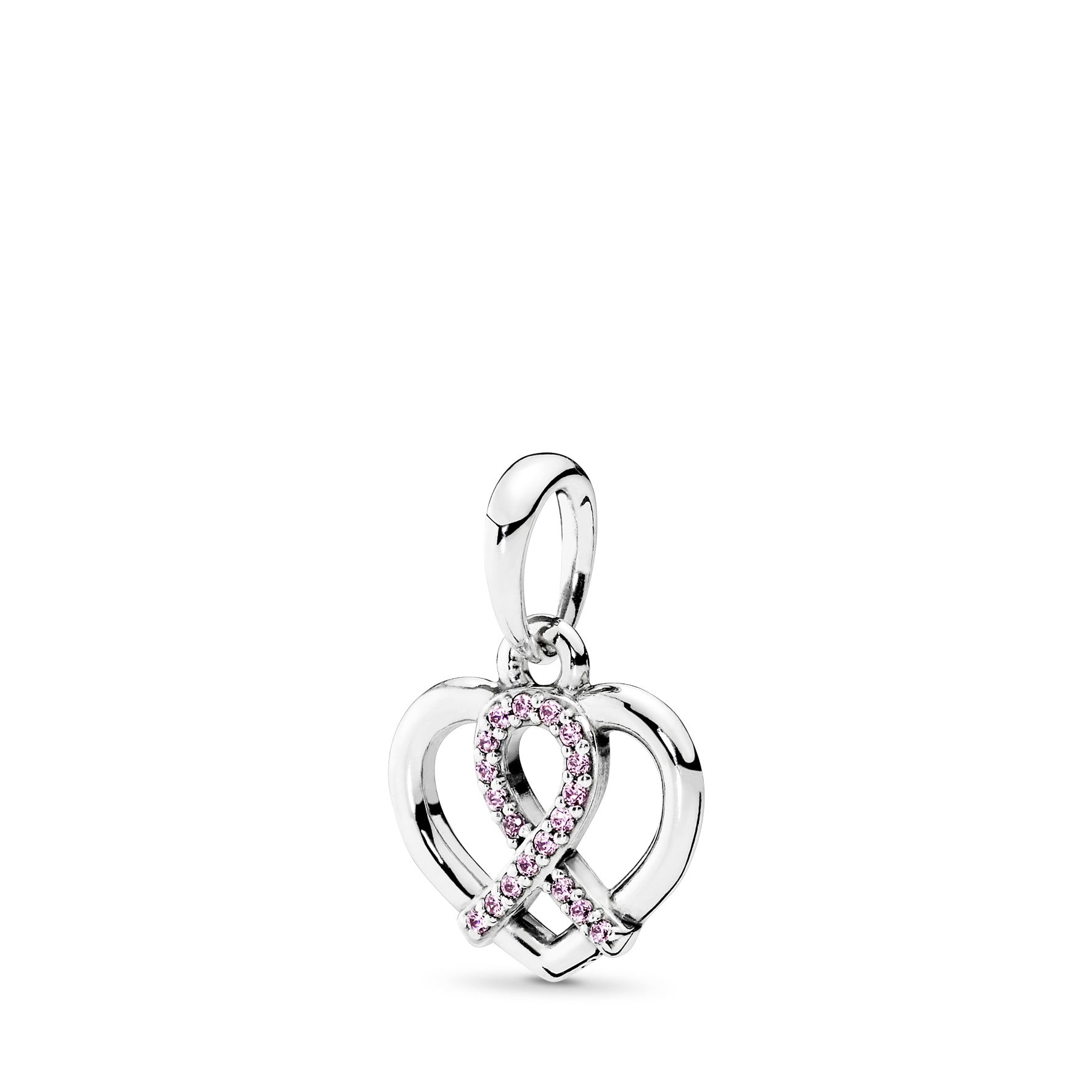 A pink cubic zirconia ribbon and a sterling silver heart create this symbolic Breast Cancer Awareness necklace pendant.