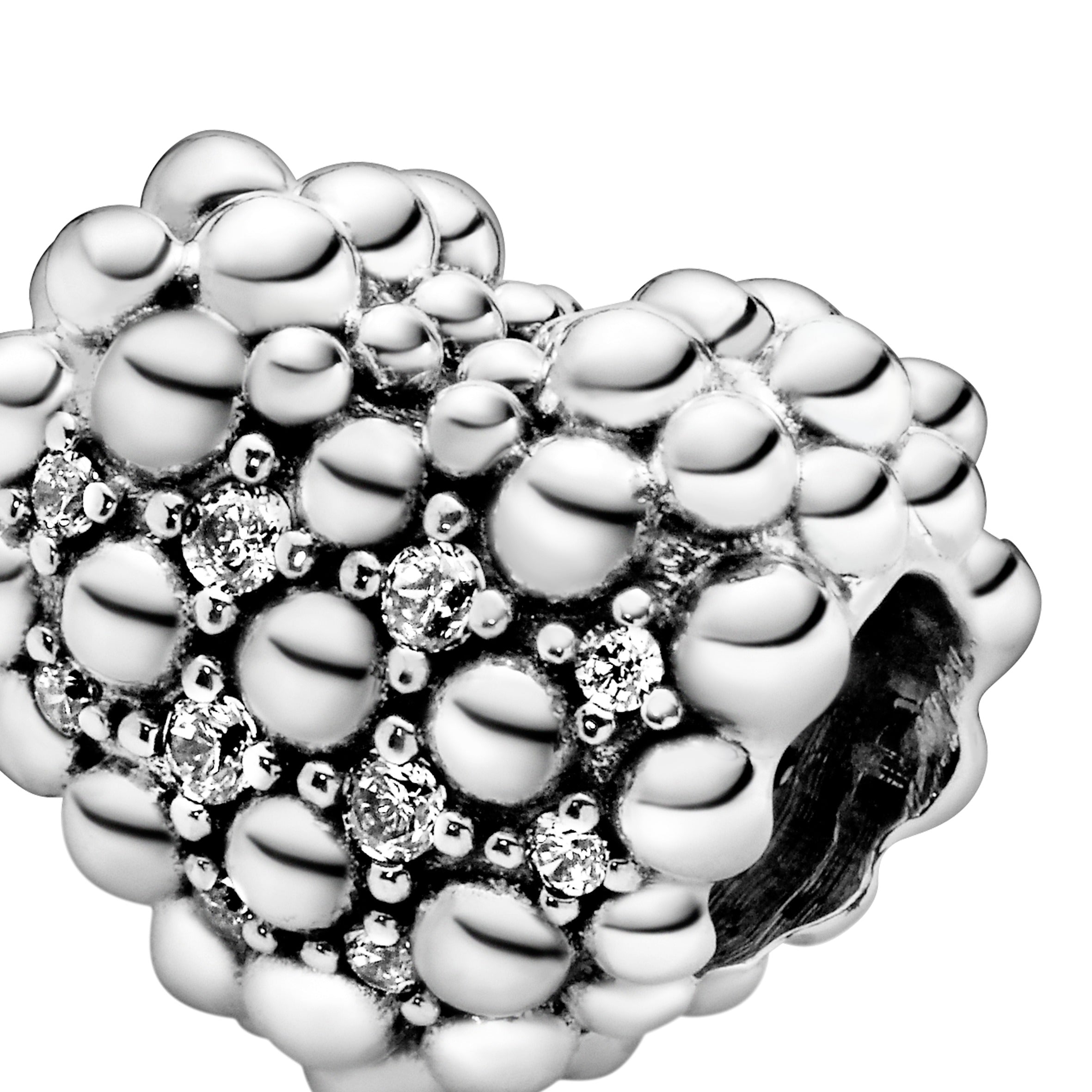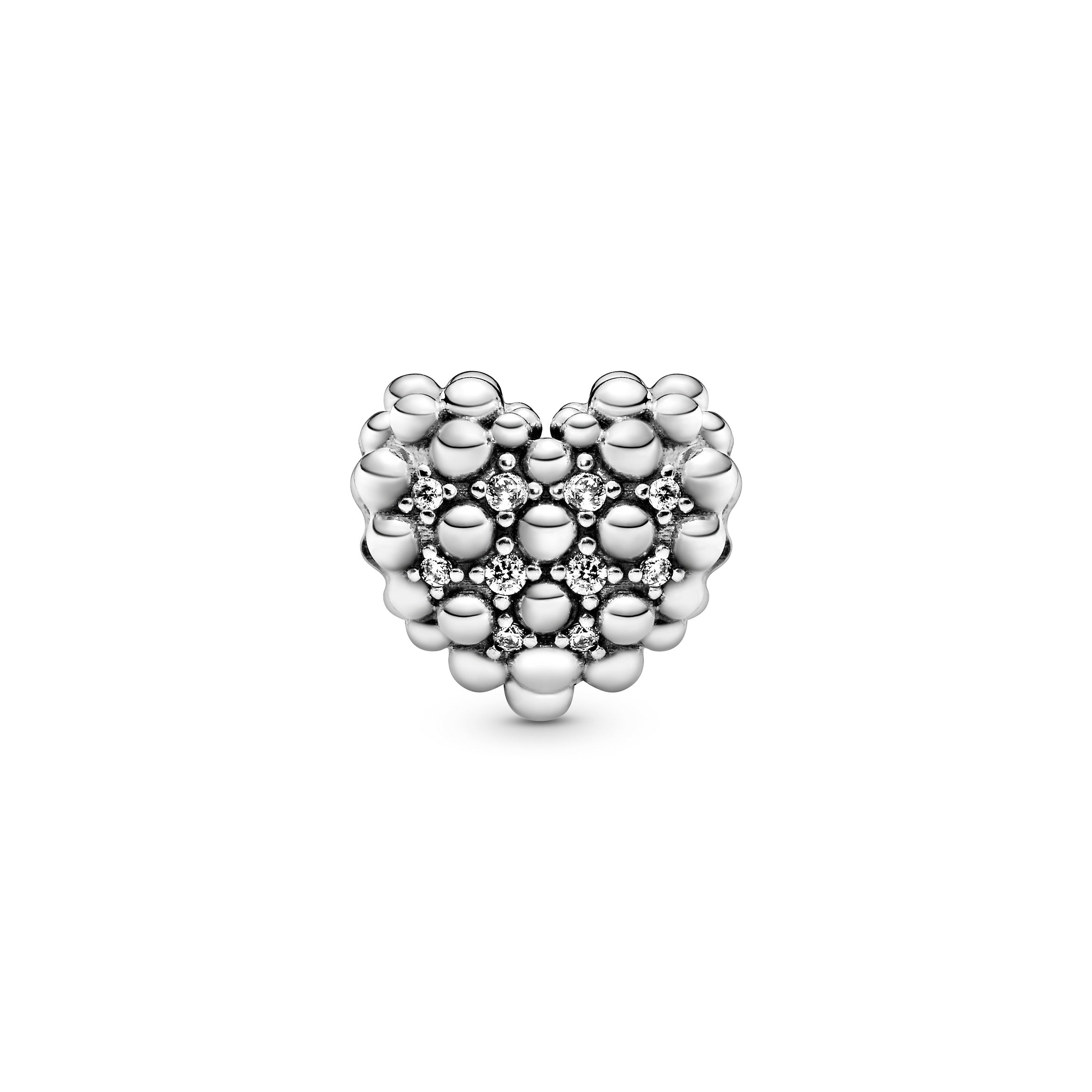 Part of the celebrated Purely Pandora collection. this three-dimensional Beaded Sparkling Heart Charm shows love is a many splendid thing. With 20 brilliant-cut clear cubic zirconia set between beads it creates a subtle and sophisticated shimmer effect when worn. Use this sterling silver charm as a reminder of all the special and memorable secrets that lie between you and a loved one and relive the glory of love each time you wear your heart.