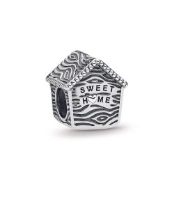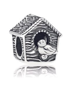 Showcasing PANDORA’s detailed craftsmanship. this pretty bird house charm in sterling silver is perfect for those who are nesting or flying the nest. It has a tactile wood-like texture. the engraving Sweet Home. and a pretty songbird perched at its door.