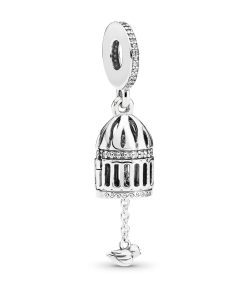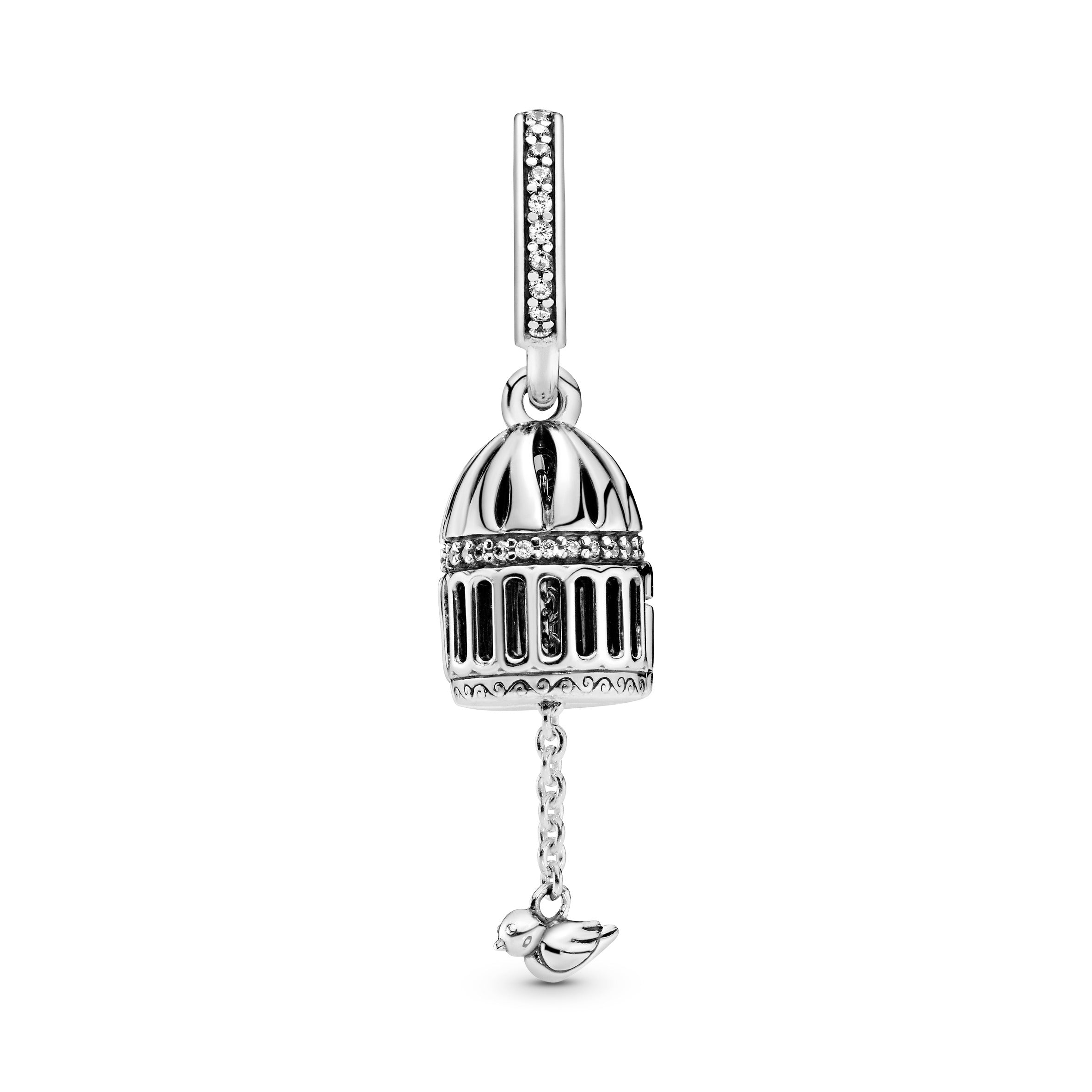 Wear a charm symbolic of breaking free with this birdcage charm. It’s made from sterling silver. one of our three signature metals. and has been expertly detailed with cubic zirconia stones for subtle sparkle. Made for Pandora Moments bracelets. open the piece to let the miniature bird fly free.
