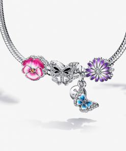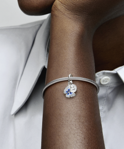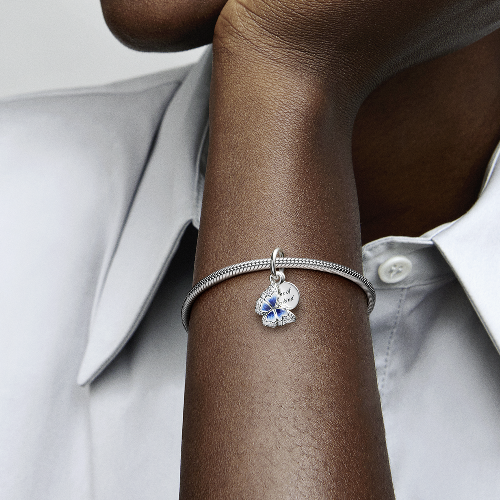 Take a moment to reconnect with nature this spring and enjoy the beauty of the season with our Blue Butterfly & Quote Double Dangle Charm. Featuring hand-painted wings and brilliant-cut clear cubic zirconia. this charm also has a sterling silver medallion engraved with the message One of a kind. Just like butterflies in nature. each charm is completely unique. Wear it with our matching blue butterfly earrings for a coordinated statement this spring.