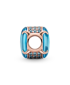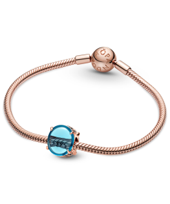 Show your love of colour with the Blue Oval Cabochon Charm. Hand-finished in Pandora Rose (14k rose gold-plated unique metal blend). this piece features two oval cabochon-cut stones to create a see-through button-shaped charm. The edges are lined with blue stones for added sparkle. Style this piece on its own on your go-to Pandora Moments bracelet for an eye-catching effect. Alternatively. wear with other colourful designs for a striking look.