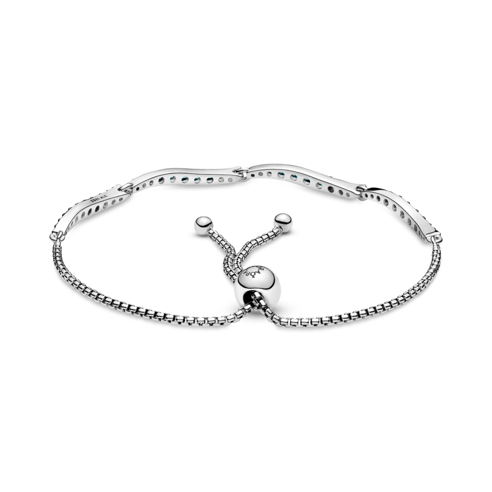 Get a daily dose of tranquillity with the Blue Wavy Slider Bracelet. Inspired by sparkling ocean water and flowing tides. this hand-finished sterling silver bracelet features rows of brilliant blue pavé bars in a wavy pattern. It’s easy to adjust the innovative sliding clasp to achieve the perfect fit for your wrist. Wear it solo or stack it high with other Pandora bracelets and charms for a look that’s all your own.