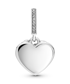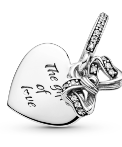 Celebrate the power of love with the Bow & Love Heart Dangle Charm. This design is hand-finished in sterling silver and features a small dangling bow decorated with clear glittering stones and a flat heart-shaped disc with the engraving The gift of love. A line of sparkling stones feature on the bail. A statement addition to any Pandora Moments bracelet. surprise your loved one with this special charm.