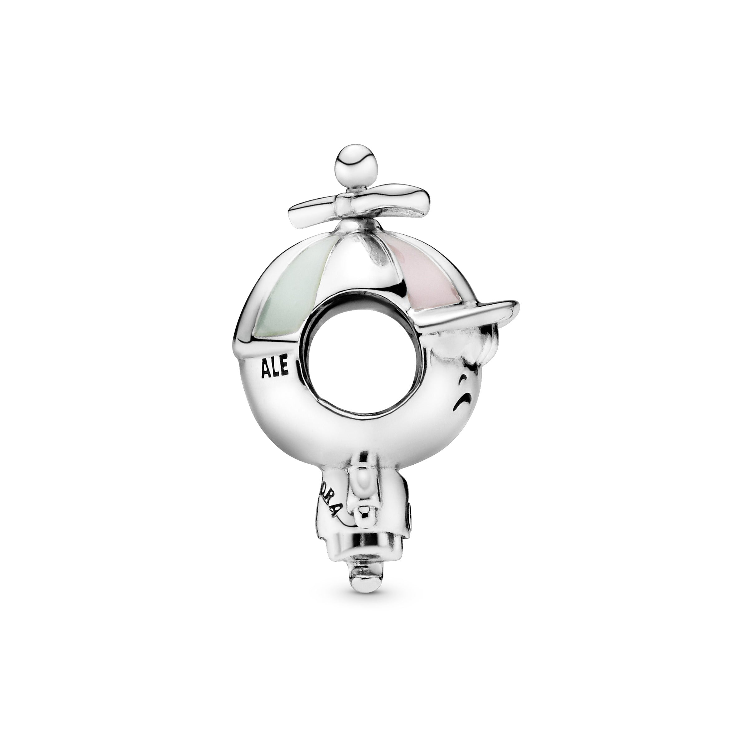 Add boyish charm to your bracelet with our character charm in sterling silver. The boy charm is topped with a rotating propeller cap in pastel-toned enamel and detailed on his belly with our Pandora crown O monogram. The charm threads onto your Pandora Moments bracelet through the head. leaving the body to dangle playfully with your every move.