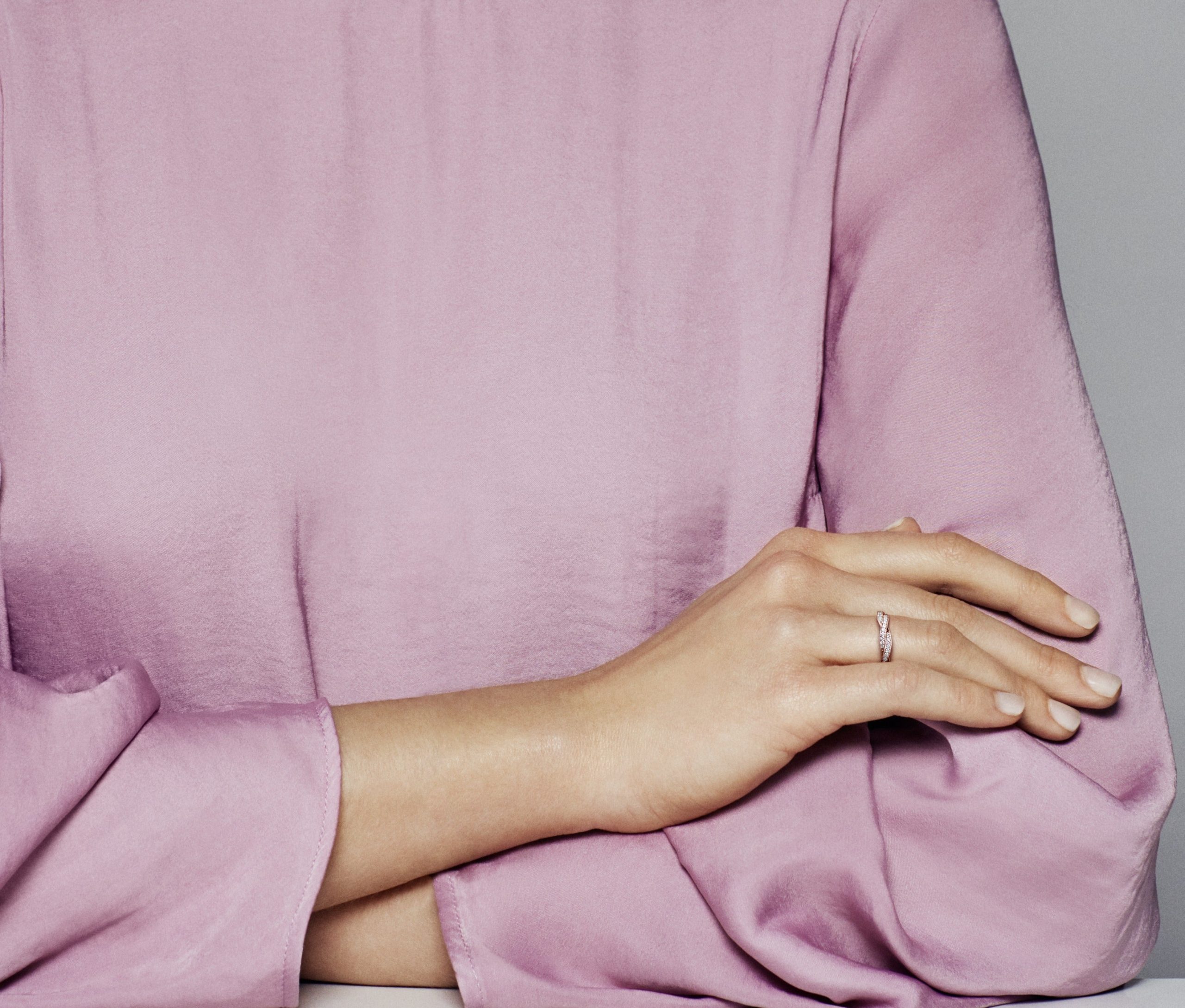 A classic. hand-finished PANDORA Rose eternity ring. featuring a sparkling braided design in a beautiful pink hue that symbolises lifelong connections.