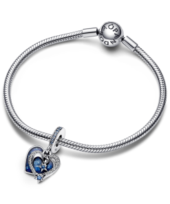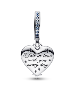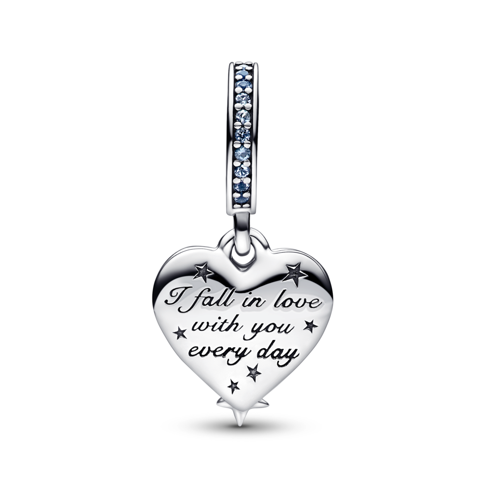 Two shooting stars come together to create a heart-shaped outline in this playful and romantic double dangle charm. crafted in sterling silver. Each star is set with a blue man-made crystal and the star trails feature clear cubic zirconia pavé. Behind the stars. a swirling galaxy effect shows through from the back part of the dangle. created with shimmering enamel in different shades of blue. The back of the enamelled part is engraved with the message I fall in love with you every day. Capture the magic of the night sky and gift it to the one you love.