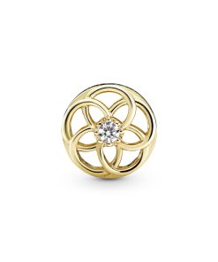 Add luxe edge to your Pandora Moments bracelet with our 14k gold charm. hand-finished and set on each side with a shimmering cubic zirconia. The openwork design is inspired by the flower and detailed along the edge with cut-out shapes that lend lightness to the piece.
