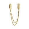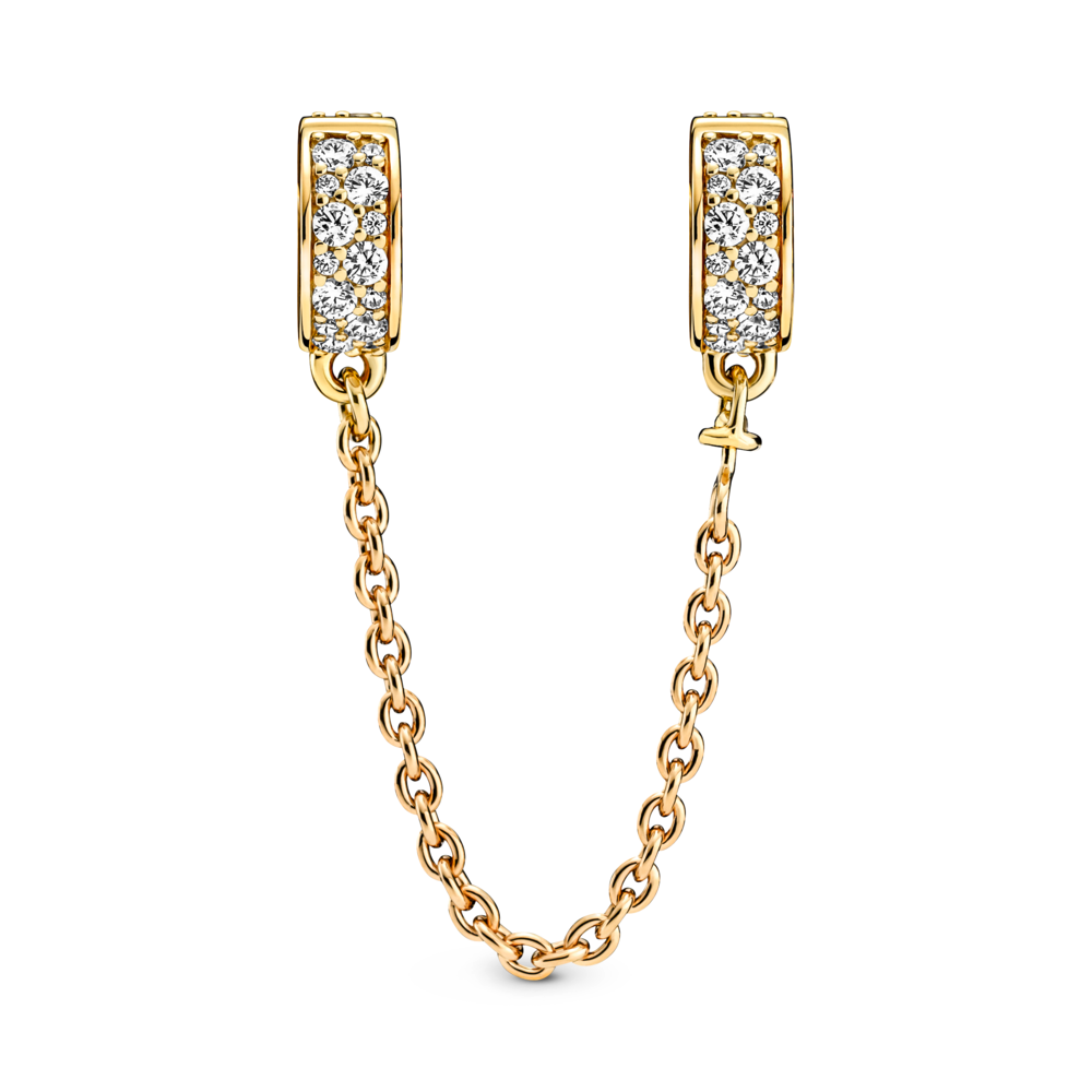 Keep your charms safe and stylish with the Clear Pavé Safety Chain Clip Charm. This safety chain charm is hand-finished in 14k gold-plated metal. It features clip charms on each end. which include silicone grips (which means they don’t fit onto threads). Embellished with clear cubic zirconia pavé. the clip charms contrast with the warm-toned metal to create a sparkling finishing touch that adds flair and security to any look.