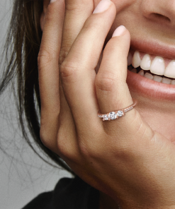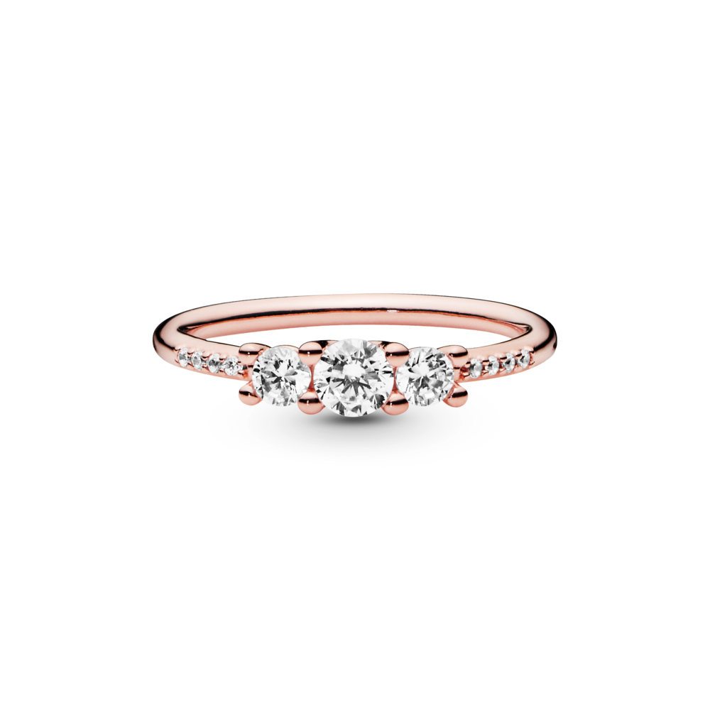 The slender band of this embellished Clear Three-Stone Ring makes it perfect for stacking with similar styles. Plated with 14k rose gold for a blush pink finish. it channels the look and feel of vintage styles. This classic ring makes a beautiful gift as a promise ring for a special someone.