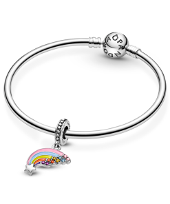 Brighten up your style with the Colorful Rainbow Dangle Charm. This sterling silver rainbow charm features tapered arcs of pink. blue. yellow. orange and lavender enamel that culminate in a shooting star on one end and are set with crystals in five different colors matching the enamels on the opposite end. The bail includes raised stars. cloud outlines and a ‘Together is better’ engraving. A bold. joyful and stylish addition to any outfit.