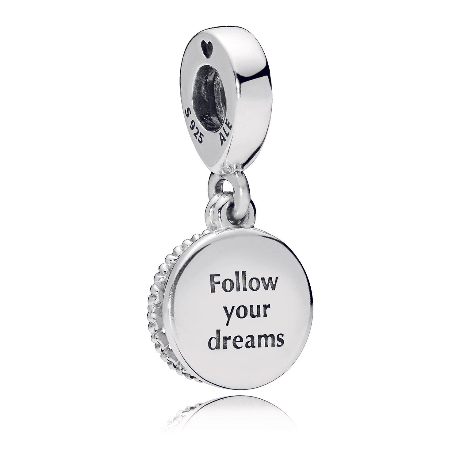 Send your style in the right direction with this dangle charm. Cast in the shape of a compass. an enduring symbol of guidance and protection. this sterling silver charm for Pandora Moments bracelets and bangles is centred with a vibrant blue crystal that’s surrounded with shimmering silver enamel and a circle of hearts. The back is engraved with the inspiring message Follow your dreams. Wear it as a reminder to take that leap.