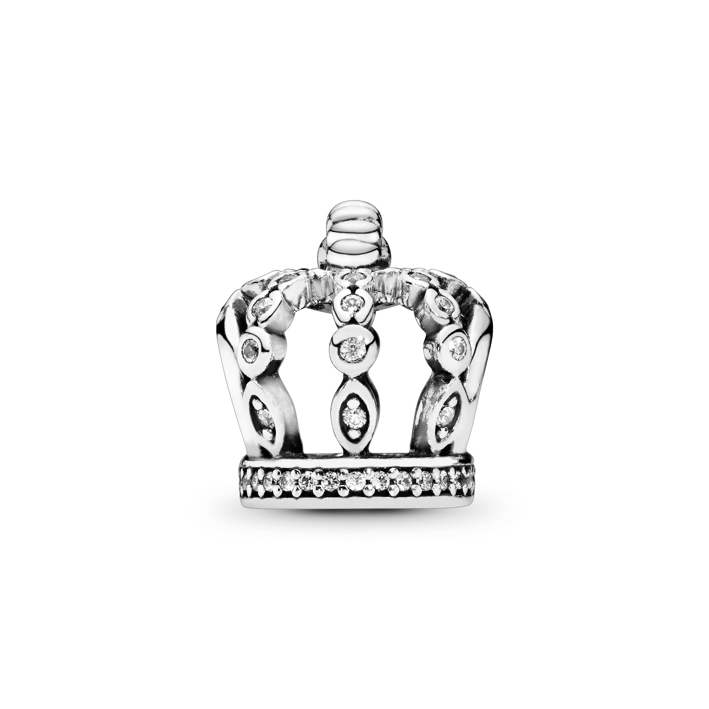 Our hand-finished sterling silver crown charm is sure to make you feel like a queen all day. every day. The crown-inspired piece has been carefully detailed with glittering cubic zirconia set in the shape of the ultimate regal symbol. Made to be worn Pandora Moments bracelets and bangles. it makes the perfect addition to any charm collection or a thoughtful gift for the queen of your heart.