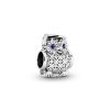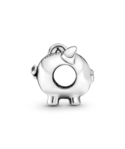 Dial up the cute factor with the Cute Piggy Bank Charm. Hand-finished in sterling silver. this charm features a polished piggy bank with a coin sticking out of its back. heart-shaped feet. raised nose and coiled tail. The coin includes ridged edges. an engraved heart on one side and a Pandora Crown O on the other. This charm represents a love of animals in all their forms. whether a fond childhood memory or your spirit animal.