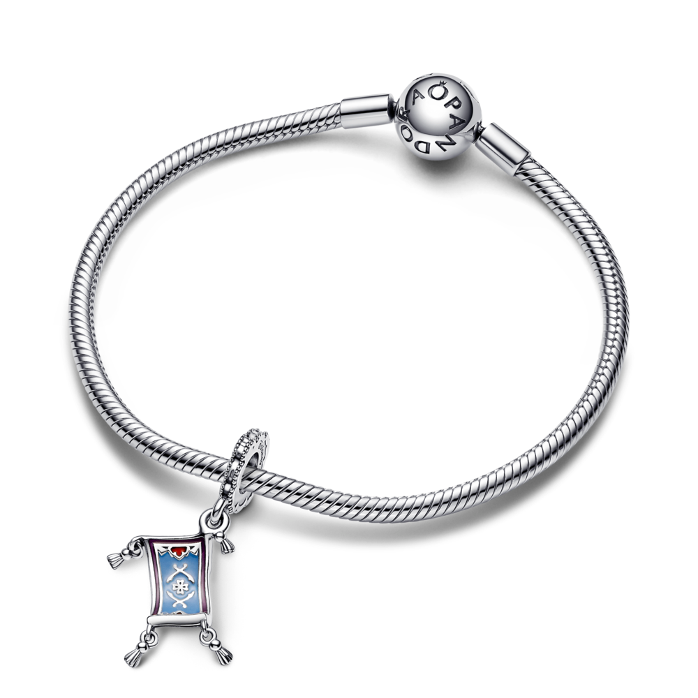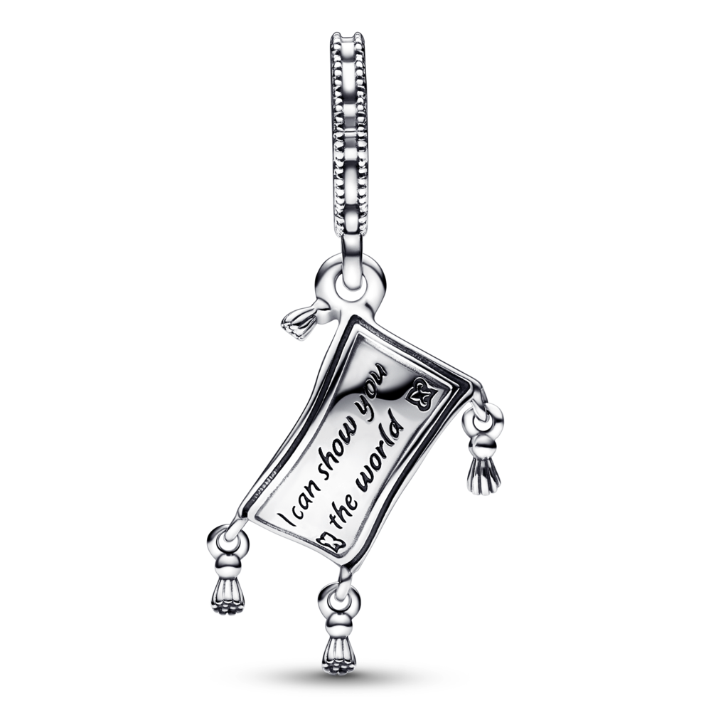 Prepare to be swept away on a magical adventure with this charm inspired by Disney’s Aladdin. Celebrate the 30th anniversary of the Disney classic with our Disney Aladdin Magic Carpet Dangle Charm. Crafted from sterling silver. this realistic charm features Carpet’s iconic motifs. created in colourful enamel. finished with moving tassels attached to each corner. The charm is engraved with the words I can show you the world on the reverse. in reference to the iconic scene of Aladdin and Jasmine soaring through the clouds in the night sky. Style this Disney Aladdin Magic Carpet Dangle Charm on your favourite charm holder to face the world with your favourite stories by your side.
