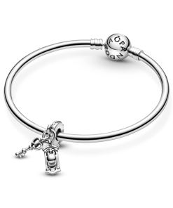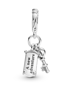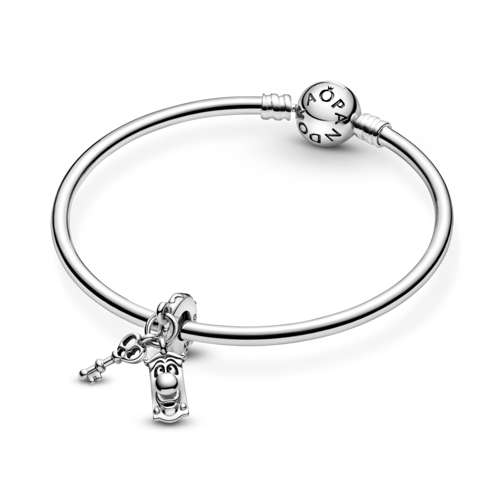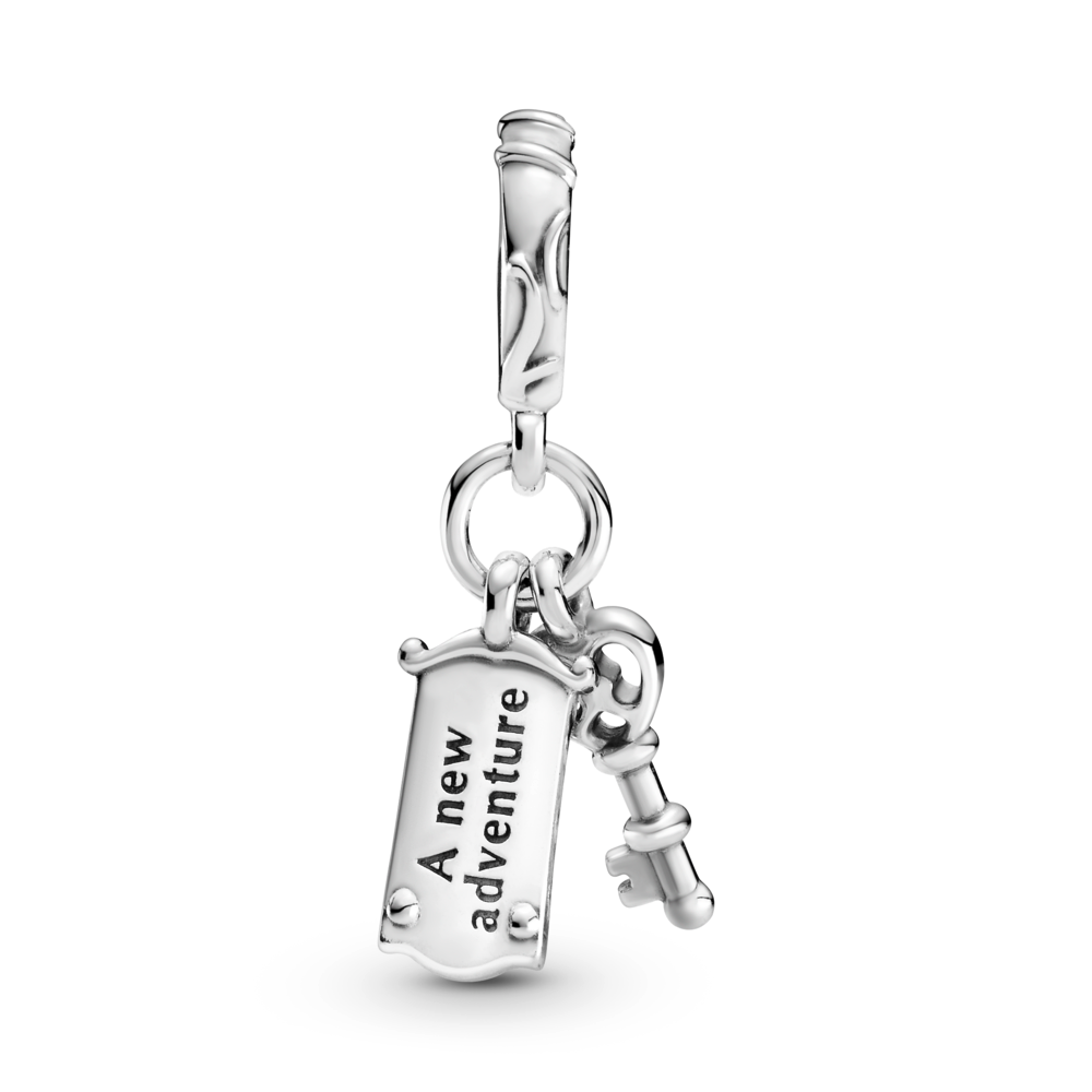 Tap into your sense of adventure with the Disney Alice in Wonderland Key & Door Knob Dangle Charm. Hand-finished in sterling silver. this charm evokes a memorable moment from the iconic Disney film. when Disney’s Alice is talking to an enchanted door knob. The adventure-filled charm features a regal openwork key and a 3D doorknob with detailed facial features and a quote from the film engraved on the backside that reads ‘A new adventure.’