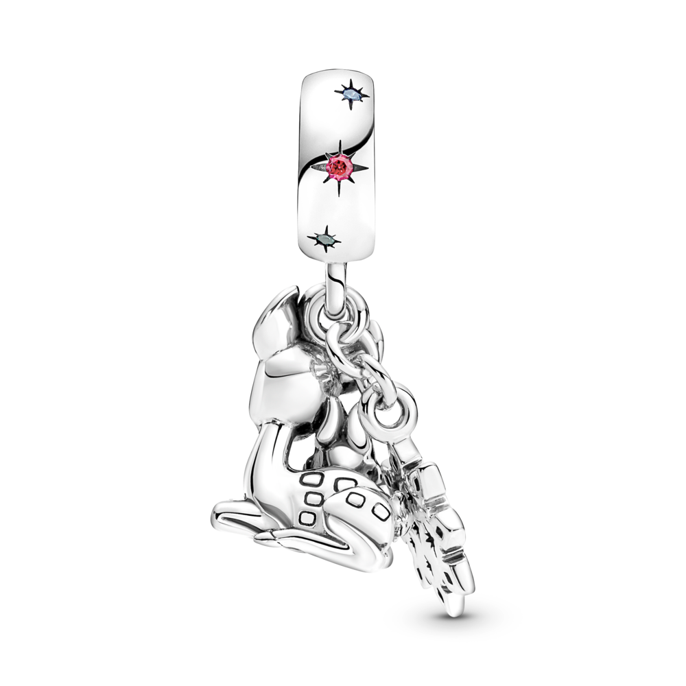 Warm your heart with the Disney Bambi & Thumper Dangle Charm. This carefully hand-finished sterling silver dangle charm features two iconic and inseparable best friends. Disney’s Bambi and Thumper. in 3D with hand-applied black enamel details bringing the sweet. friendly duo to life. The charm also features a shimmering snowflake disc engraved with Merry Christmas and stars. along with multi-coloured stones set in stars on the bail. Festive for the holidays. full of joy and meaning all year-round.