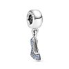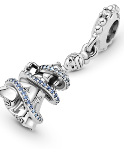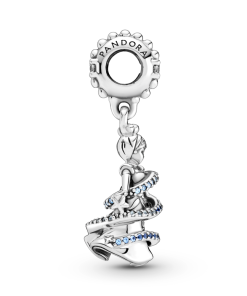 Prepare to be spellbound by the Disney Cinderella Magical Moment Dangle Charm. Hand-finished in sterling silver. this piece is designed to celebrate the 70th anniversary of Disney’s Cinderella. The design includes the spinning princess dressed in a ball gown and surrounded by a swirl decorated with blue stones. Including a beaded bail with clear stones. style this piece on your bracelet with other twinkling dangle charms for a ball-ready look.