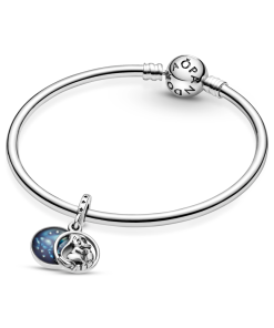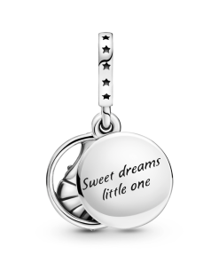 Believe in magic with the Disney Dumbo Sweet Dreams Dangle Charm. Hand-finished in sterling silver. the circular front disc features a 3D version of Disney’s Dumbo snuggling into Mrs. Dumbo’s trunk. Clouds. stars and a crescent moon shine through the hand-applied transparent blue enamel that decorates the back disc. The engraving Sweet dreams little one features on the back. Engraved stars decorate the bail for added detail. Pair with other Disney x Pandora charms for a playful look.
