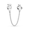 Add the finishing touch to a bracelet styling with Disney’s lovable Mickey and Minnie Mouse who help keep charms safe on a Pandora Moments bracelet. This safety chain charm in sterling silver is shaped as hearts and detailed with sparkling cubic zirconia-embellished silhouettes of the legendary Disney duo. The swivel chain ensures it won’t get tangled while in use.