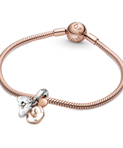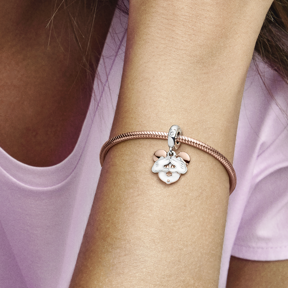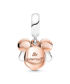 This Disney Mickey Mouse Double Dangle Charm is the perfect reminder to always be yourself and trust in who you are. Hand-finished in sterling silver and 14k rose gold plating. this charm features Disney’s Mickey Mouse peeking through his hands. with two separate elements of the charm that allow him to lift his hands away from his eyes and come out from hiding. Decorated with white enamel details and an engraving on the back that reads Be yourself. wear yours as a celebration of your individuality.