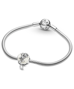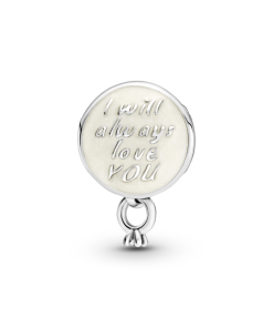 Gift your love the Disney Mickey Mouse & Minnie Mouse Eternal Love Charm. Hand-finished in sterling silver. this convex-shaped design includes Disney’s Mickey Mouse carrying Minnie Mouse surrounded by shimmering silver hand-applied enamel. A small ring set with a sparkling stone dangles from the bottom of the charm. The raised message I will always love you in sterling silver letters features on the back. Cut-out hearts decorate the sides of the piece. Celebrate your romance with this special design.