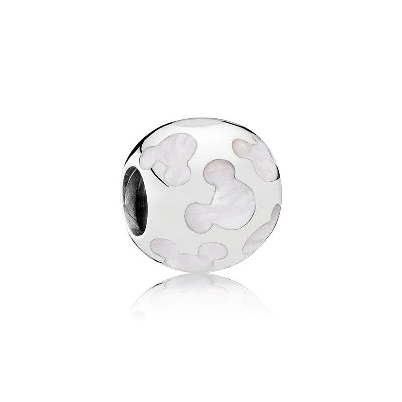 Luminous and iconic. Mickey Mouse silhouettes in mother of pearl are expertly set in the sterling silver of this elegant charm. A classic treasure for your Disney jewellery collection.