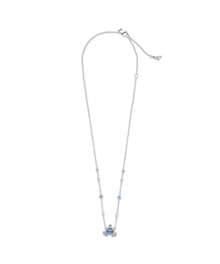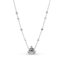 Celebrate the 70th anniversary of Disney’s Cinderella with the Disney Pumpkin Coach Collier Necklace. Hand-finished in sterling silver. the pumpkin carriage-shaped design includes a central blue stone surrounded by clear cubic zirconia with a 3D crown on top and swirled leaf detailing for wheels. Larger stones are fixed along the adjustable chain that features Cinderella’s slipper and a Pandora crown O monogram logo tag dangling from the clasp. Style with sterling silver earrings for a tonal look that’s simply magic.