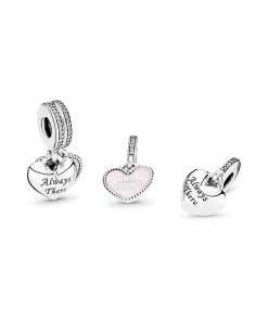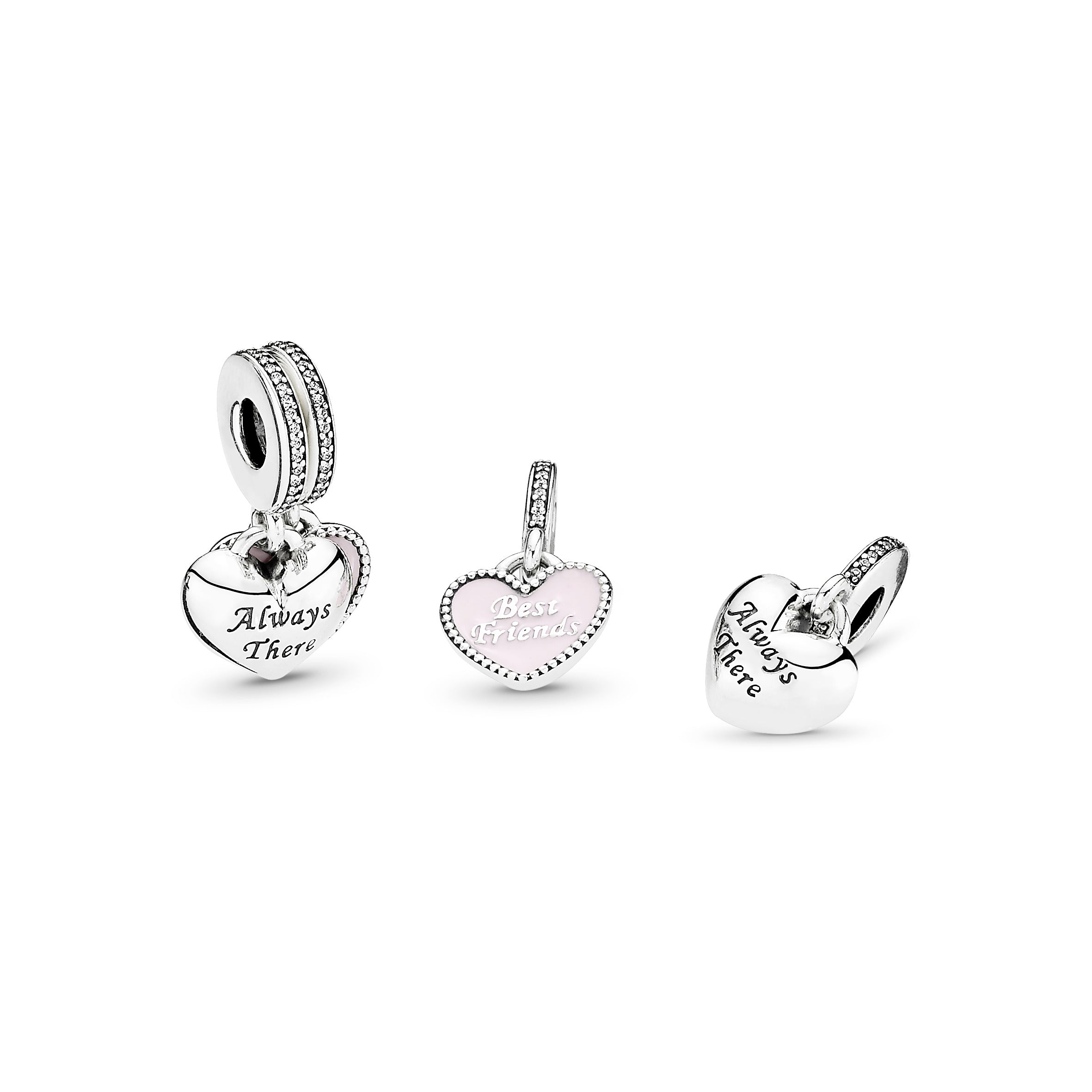 Sharing is caring. as the saying goes. Bring the sentiment to life with our friendship charm. Made from sterling silver. the double dangle design holds two hearts: one is decorated with hand-applied pink enamel and the words Best friends and the other is minimally detailed with the engraving Always there. Perfect for carrying your story with you.