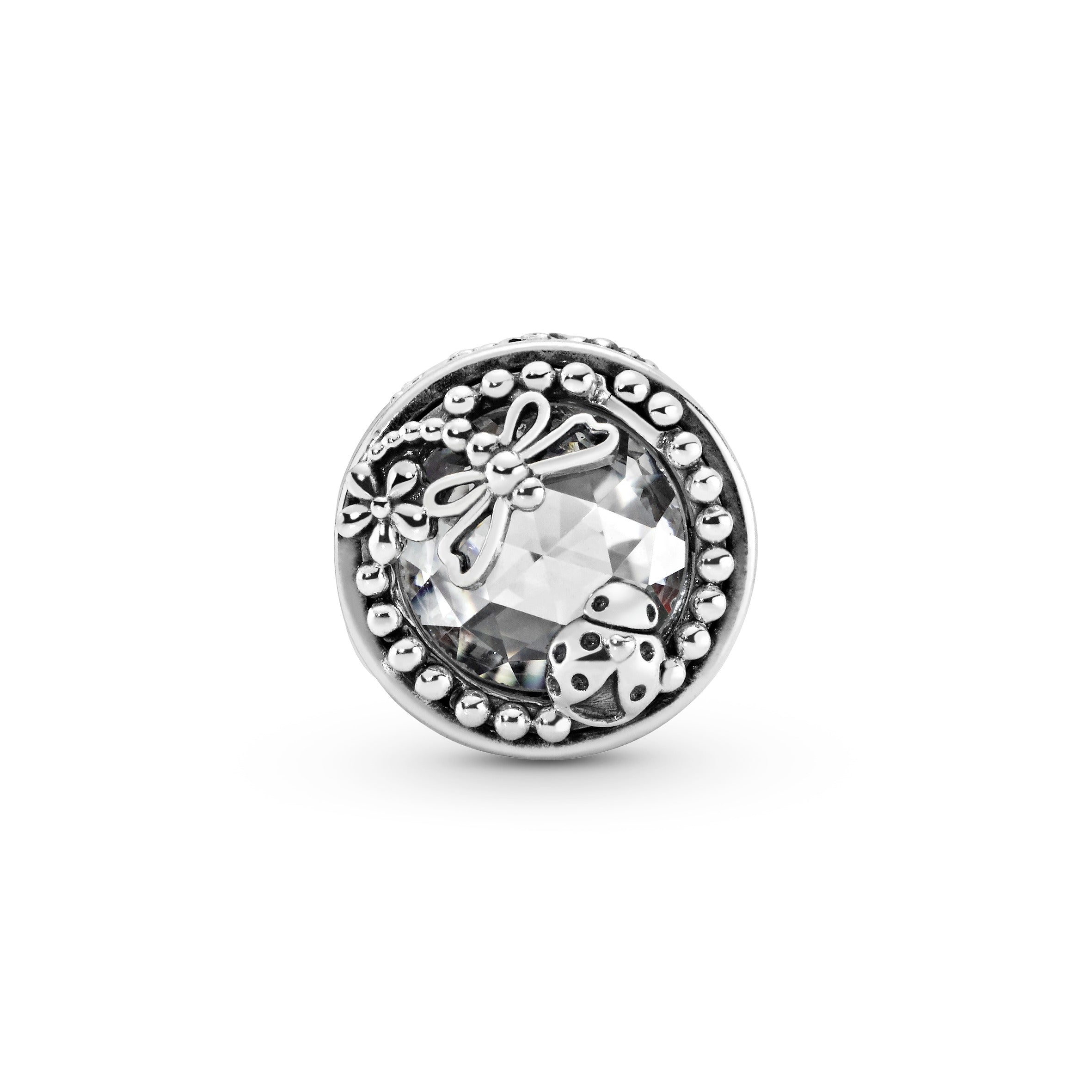 A showstopping piece that’s sure to make a statement on your Pandora Moments bracelet. this sterling silver charm is set with cubic zirconia that lend sophisticated sparkle to your look. The nature-inspired design features a dragonfly and ladybird – symbols of transformation and luck – on each side and openwork flowers along the edge.