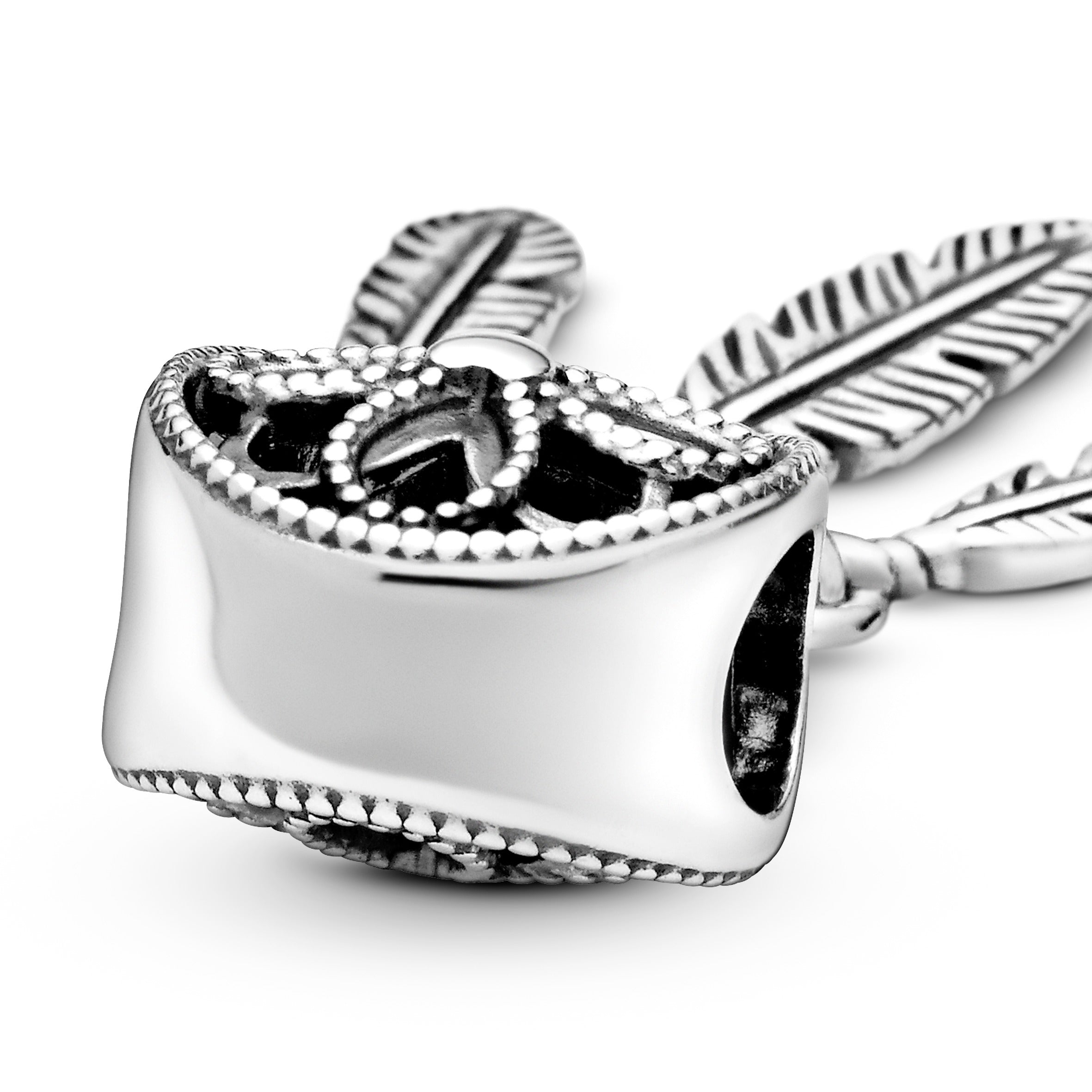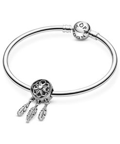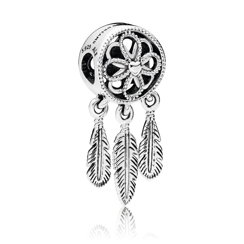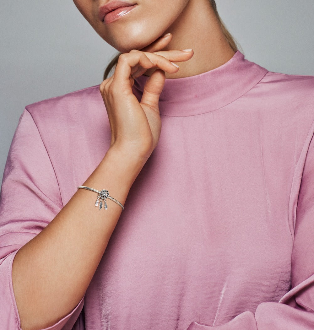 Wear a mix of personal sentiments and symbols with talismanic power on your Pandora Moments bracelet. Inspired by the Native American dreamcatcher. believed to trap bad dreams in its net while allowing peaceful dreams through. our sterling silver dangle is strung with pretty feathers for subtle movement. We can’t promise it will bring you sweet dreams. but we can assure you it’s perfect for every kind of dreamer.