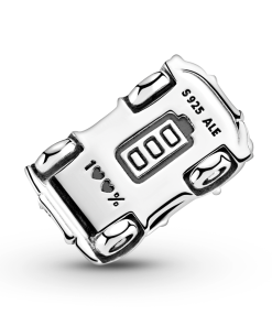 Wear your love of eco-conscious travel with the Electric Car Charm. Hand-finished in sterling silver. this car charm includes realistic details like a spare wheel. side mirrors. hood. front light and a stamped battery on the underside. Stylistic details include license plates with partial Pandora monogram and a back plate with the word ‘LOVE’ where the O is a red enamel heart. as well as an oxidized grooved rope holding a raised heart on the roof.