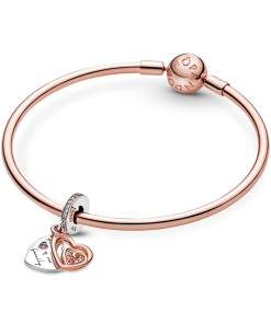 Double up on love for Mum with the Entwined Infinite Hearts Double Dangle Charm. A 14k rose gold-plated heart with pink man-made crystals glow next to a sterling silver heart. engraved with the words: You are the heart of our family. The bail is accented with a pavé of pink and clear stones. The perfect gift for someone who always has a special place in your heart.