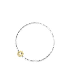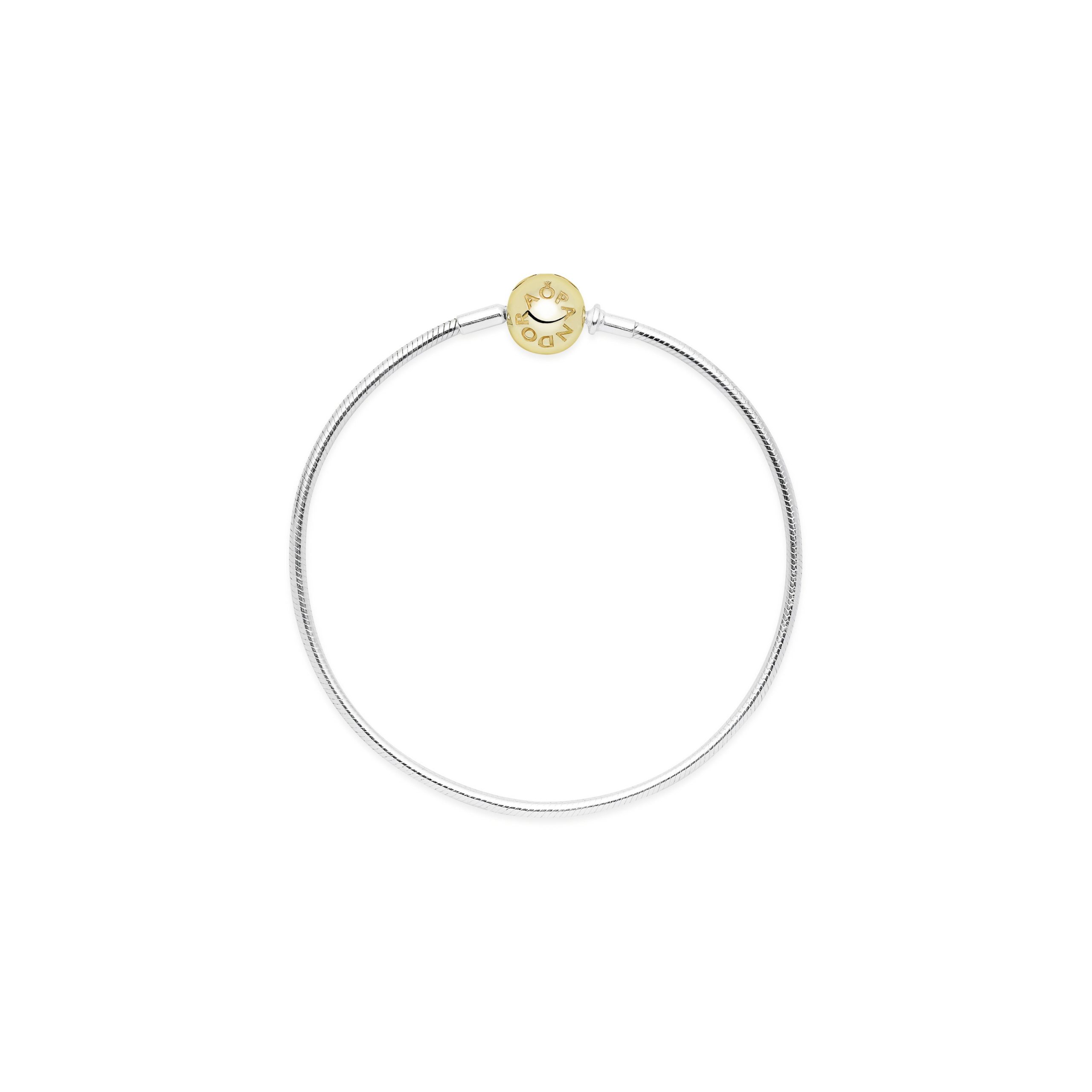 The slender. hand-finished PANDORA ESSENCE COLLECTION bracelet is now available in two-tone: sterling silver with a 14k gold signature clasp. Stack it with sterling silver and fabric strand bracelets to achieve an on-trend look.