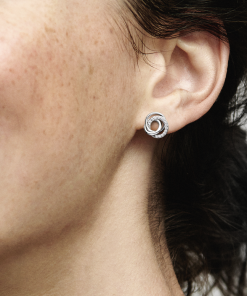 Inspired by everlasting love. the Family Always Encircled Stud Earrings feature three entwined circles – two polished sterling silver and one decorated with a row of clear cubic zirconia pavé. The harmony of various shapes symbolises how families come together despite their differences.