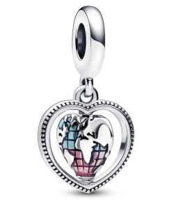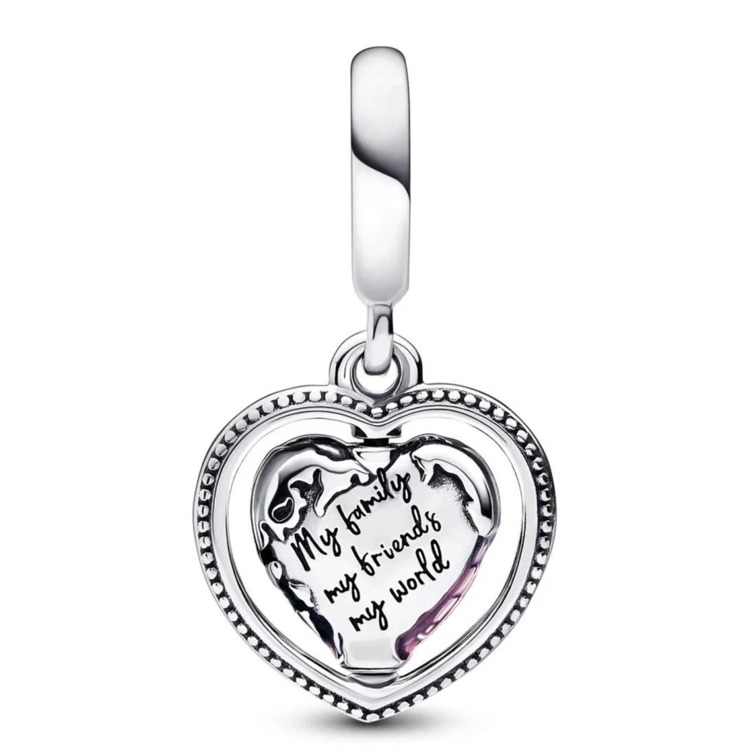 Celebrate all the people who make your world go round with the Family Spinning Heart Globe Dangle Charm. This graphic piece features a heart-shaped globe decorated with gradient enamel that spins to reveal a message on the other side: My family my friends my world. Pair with other family-inspired pieces and keep your loved ones close at all times.