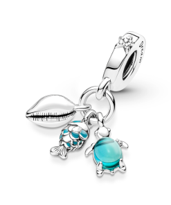 Go on a snorkelling adventure and meet the beautiful creatures of the dreamy deep blue sea with this ocean-themed triple dangle charm. This trio of sterling silver dangle charms includes a conch shell. a scaled fish with turquoise enamel detailing and a sea turtle with two-toned blue and green Murano glass as its shell. The bail features a tiny raised starfish and the messages Explore and Dream. reminding you to seek your next adventure. wherever that might be.