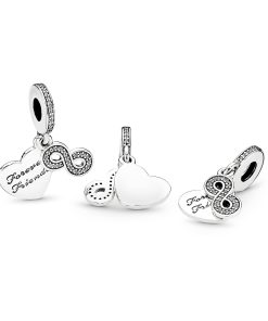 Wear or share this friendship charm to show that friends are forever – just like its engraving says. Cast from sterling silver. it’s shaped into two dangles: a heart and a stone-studded infinity symbol for extra sparkle to the personal piece. It’s made for our Pandora Moments charm bracelets. but looks equally cool as a necklace pendant.
