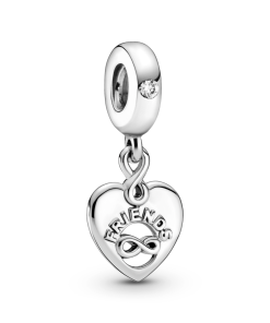 Discover a special charm for your BFF with the Friends Forever Heart Dangle Charm. Hand-finished in sterling silver. this heart-shaped dangle includes an asymmetric infinity sign cut-out with Friends in raised lettering on the front and the engraving Forever on the back. Another infinity sign connects the dangle with the bail. which features a sparkling clear stone. Let your bestie know that your friendship will last a lifetime with this piece.