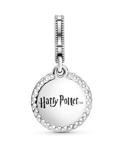 Pandora Moments Harry Potter. Ravenclaw dangle Metal: Sterling silver Stone: 1 micro and 2 star flush-set round brilliant-cut sea blue crystals Motif/Shape: The double dangle design features a front disc detailed with the Ravenclaw house logo surrounded by blue stars and a back disc encircled with cut-outs. The bail is shaped as the Hogwarts crest. Engraving: Harry Potter ; Learning. wit. wisdom ; Ravenclaw